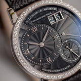 Making up the other half of this set is the smaller reference known as the Kleine Lange 1 reference 811.062. Despite the core functionality remaining the same as its larger partner, this Kleine Lange 1 differs substantially with its visuals due, for the most part, to its diamond-set bezel. Totally 64 brilliant-cut VVS diamonds, by swapping out the rounded bezel of the 38.5mm Lange 1, this petite example is entirely transformed with elevated glamour and extra flamboyance. Regardless, thanks to its mid-sized case width, and sleek dial colour, the watch remains refined and sophisticated. Furthermore, the bezel change also impacts the perception of the dial as it shifts, giving it a more prominent presence on the wrist.