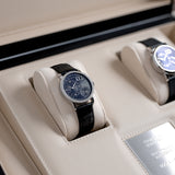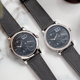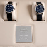 This A. Lange & Söhne 20th Anniversary Platinum Set "The Death Star" is presented as a complete full set. This includes the special anniversary twin watch box and the original alligator straps for both watches. The watches themselves remain in excellent, barely worn and as new condition. Both watches are fitted with Mr Watchley Grained Grey watch straps.