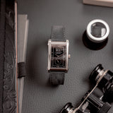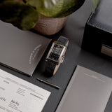 This is an emotion that translates effectively when attention shifts to the dial of this 107.035. Conceiving something that is simplistic, original, and above all else attractive is a lot harder than it looks when it comes to horological design. Being able to avoid emulating watches that pre-date a new design is an art within itself and fortunately for the Cabaret, it's a skill that A. Lange & Söhne possess. Significantly every piece of dial furniture of the Cabaret is a defining aspect of the complete watch, contributing greatly to the character of the model. Surrounding the rectangular dial of this piece is two thin white lines following the entire shape of the dial creating concentric rectangles which frame the watch effortlessly. Housed between the two lines are the raised hour markers. Complete in white gold and featuring Roman numerals for the twelve, three, six, and nine as well as angular diamond shapes for the remaining hours, both sets of markers truly give the watch an almost gothic-like appearance. To emphasise the Saxonian heart of A. Lange & Söhne, a large double date aperture commands the top half of the Cabaret dial which is also surrounded by a white gold border; a beautiful contrast to the harsh and heavy properties of its platinum externals. Towards the bottom of the dial, a sub-register keeps track of the passing seconds with a concentric circle guilloché as its canvas. The hands featured on this piece are yet again finished in white gold and are complete in the brand favourite alpha style for the hours and minutes. The second-hand features a large counterbalance with a diamond-shaped point.
