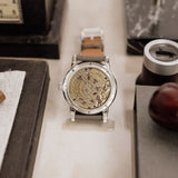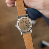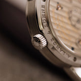 Measuring 38.5mm wide this platinum encased watch is a proportional masterclass with a thin brushed case body fitted with straight lugs which hug the wrist from behind. From a top-down view, the watch is polished from bezel to lugs with the addition of tapering chamfers gently blending into the brushing seen from a profile view.