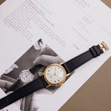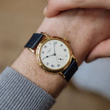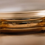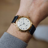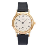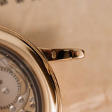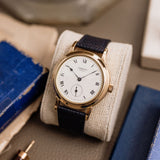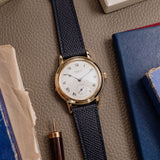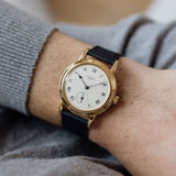 While Andersen Genève dials are known today for their incredible unique guilloché, blue gold, enamel decoration, and stones, the dial seen on this mid-90s example is undistilled and truly timeless. Silvered with a golden-coloured dot minute track that turns to black every five minutes, this classically formed dial is complete with compact black-printed Roman numerals and a subsidiary seconds register at six. An ever-endearing set of blued spade hands read the hours and minutes and a needle-style blued hand tracks the seconds.