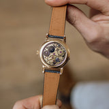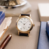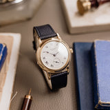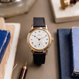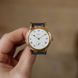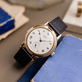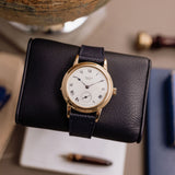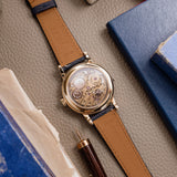 This 1995 Andersen Genève Minute Repeater is in fantastic condition with only light hairline scratches visible. The original 'A' Andersen pin buckle in rose gold is also included with the sale, along with service papers detailing the work completed by Andersen in 2022 and a Mr Watchley Grained Midnight Blue strap.