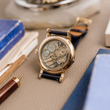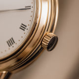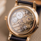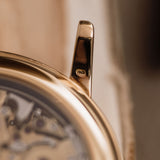 Dating from 1995, this remarkable, unique, minute repeater is rendered in 18k rose gold with limitless charming case nuance. While the bezel isn't stepped, its rounded form appears to be at a glance thanks to two concentric circles on both sides of the bezel edge. Emerging from the 38mm wide case with utter elegance is a set of lovely straight lugs reminiscent of the Patek Philippe 3448 and the more modern Rexhep Rexhepi Chronomètre Contemporain II. Sitting on the left of the svelte case is the minute repeating slide, a design Svend invented in 1987, with the crown opposite to set and manually wind the watch. The case found on this minute repeater is second to none, and the reason why can be answered by simply listing the three letters found between the lugs on the case: JHP