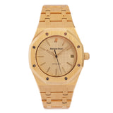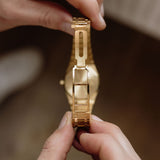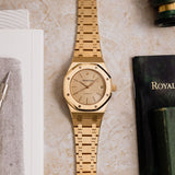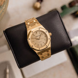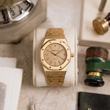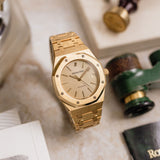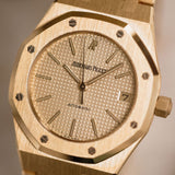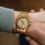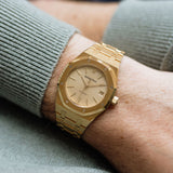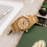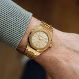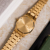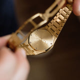 One variable trait of vintage and neo-vintage watches that's hailed above all is condition. It's the difference between a good watch and a great one, with 'new old stock' representing the zenith of desirability. Purchased in 1998 by its original owner and having spent 23 years untouched in a safe before a movement-only service by AP in 2021, this 14790BA is presented today in true new old stock (or NOS) condition. With the 'BA' indicating its rendering in 18k yellow gold, this is just about as good as it gets, with each side of the emblematic octagonal bezel, tonneau case, and eternally contemporary integrated bracelet still displaying the deep, factory vertical brushing throughout. The flawless finish flows from the bezel to the case, and the whole length of the bracelet, only pausing for polished accents on the chamfer and the eight bezel screws. This enduring example and its remarkable condition is a testament to the meticulous refinement achieved by Audemars Piguet.