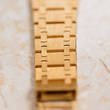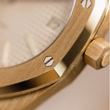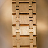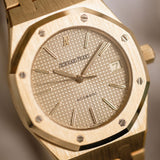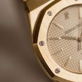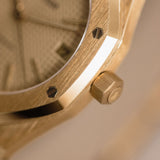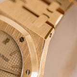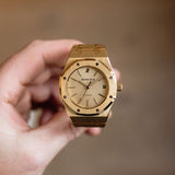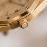 With the Royal Oak, much of the conversation is centred around the case and bracelet for its revolutionary advent, but the dial harbours just as much interest and nuance throughout the full spectrum of references. With this particular 14790BA, we have a matching yellow-gold series two dial and date aperture at three. Not as rare as the series one and more desirable than the modern series three, these dials offer updates with tweaks to the typography and very subtle changes to the hands and baton marker thicknesses. Nevertheless, the golden colouring throughout the entire dial is made all the more charming by the colour the luminous material has turned in the hands and markers.