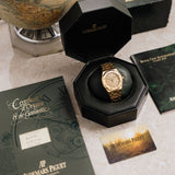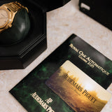 This 14790BA is a rarity being offered today in like new, 'new old stock' condition. The watch shows no signs of wear throughout the entire case, bezel, clasps, and tight bracelet. In 2021, the watch visited Audemars Piguet for mechanical service only and comes with the AP service card, along with the original inner and outer box, papers, and certificate of origine and guarantee.