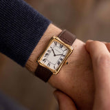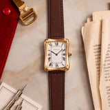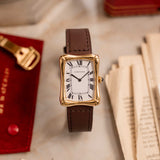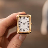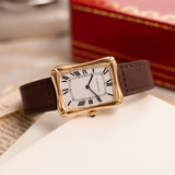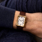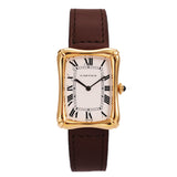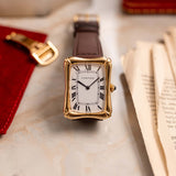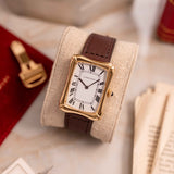 18k yellow gold forms the incredibly unique shape of the case. The ringed form of a Bamboo stem gives the case its rectangular form, yet the normally upright and straight line of natural Bamboo has been given a distinct, organic flow. This piece is alive with movement and an unmistakable 70s groove. As Cartier's traditional railway minute track lightly expands outwards, the bezel follows suit while the outer lines of the case counter the move and flow flawlessly inwards. The crown at the 3 is particularly prominently beaded, a small touch of 70s glamour, and complete with a rounded, blue sapphire cabochon. The white lacquered dial displays absolutely no signs of age and, complete with its black printed Roman numerals and blued hands, is in perfect condition.