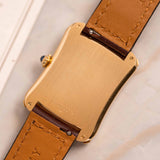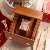 This Bamboo Coussin is a rare, and highly unique in its style, vintage Cartier timepiece that is in absolutely incredible, original and untouched condition. Not only is the condition spectacular but the timepiece comes with its original box and Cartier yellow gold folding buckle, as well as its original and barely-worn, black Cartier strap.