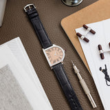 Naturally, the dial is quintessential Cartier, except for the elements that are not. While the presence of black Roman numerals, pomme hands (here in white metal), and a black chemin-de-fer track meet expectations, the rest of its features stray from the norm. It begins with its vertically brushed salmon dial, a light colour that cleverly pairs with the heavy-hitting platinum of the case. Secondly, the 12 Roman numeral, XII, has been replaced with an Arabic '13' numeral, a nod to the historic number 13, Rue De La Paix address. While this addition is consistent with other Rue De La Paix editions such as the Driver, Tortue Monopoussoir, and Tank, it particularly stands out on the Cloche due to the curve of the 3 mirroring the unique curved edge of the Cloche's case. The result is a face that feels distinctly Parisian, considered and poised, like a Haussmann façade viewed from an unexpected angle.