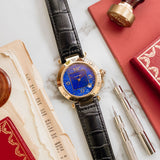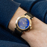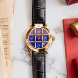 The dial follows the signature style of the Pasha de Cartier with its square within a circle, beautifully brought to life by the difference in the pieces of stone used. Deep blue lazurite is used for the central square, the heart of the watch, which is signed and framed in gold. Across the rest of the dial, we see a key feature of lapis lazuli - its pyrite flecks, its golden stars - sparkle.