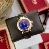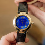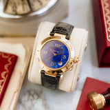 This mesmerising Cartier creation is one of pure blue beauty. With its combination of yellow gold, diamonds and the heavenly deep blue of its dial, this Pasha de Cartier simply goes above and beyond.