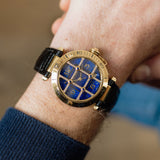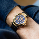 The blue of the dial, that blue of an infinite and all-consuming starlit night sky, is fashioned from the semi-precious stone, lapis lazuli. A mix of deep blue lazurite, golden pyrite and white calcite amongst other minerals, it is considered to be a highly spiritual stone, able to foster the connection between the physical and celestial planes. There is an undeniable feeling of something quite profound in its presence.