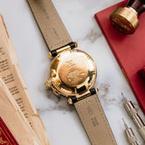 Applied, yellow gold hour markers are located just at the 12, 3, 6 and 9, part of the Pasha design code, whilst at 4:30 a round date aperture is located and magnified by a small cyclops on the sapphire crystal. Polished yellow gold sword hour and minute hands, together with a gold seconds hand, complete the precious dial.