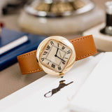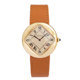 Perfectly round and, well, pebble-like, the case of the Cartier Pebble has a domed flying saucer-like structure with the lugs behind hidden from view. Completely polished throughout, the exterior of the modern Pebble very closely resembles the original at 36mm wide with a 6.3mm thickness, compared to 35.4mm and 5.3mm. Despite the unusual rendering, the hallmarks of a Cartier remain faithful, with a cabochon-tipped beaded crown at three leading nicely into the familiar yet different dial.