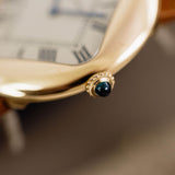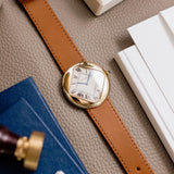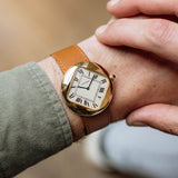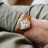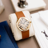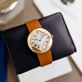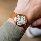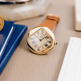 Square in round, rotated and presented as a diamond, the dial of the Pebble is the perfect intersection between unique but not kitsch, as the orientation of the numerals and form remain conventional. Yet, the impact is striking. The legendary Cartier design language still rings true, with a central black railroad track, black Roman numerals, thermally blued sword hands, and a soft brass opaline dial. Worthy of note are the four cardinal numerals as they gently concave around the sharp right-angle edge of the railroad track. It's details like this that set the Maison apart.