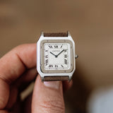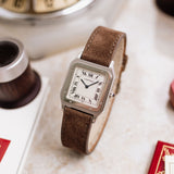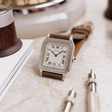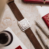 Adorned with tiny screws encircling the mirror-polished platinum bezel, this model exemplifies one of the distinctive style elements associated with the Santos lineage. This exquisite Platinum Cartier model features a slightly larger case compared to its vintage counterpart, measuring 36mm x 27mm, making it an ideal choice for formal occasions.