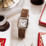 The Cartier Santos Dumont with reference 1575-1 – is powered by the manual-wound 021MC caliber, based on the Frédéric Piguet 21 and designed as the thinnest watch movement on the market with a diameter of 20,4mm and 1,75mm thickness (it has hold up to this reputable claim for 21 years). The 021MC has a power reserve of 42 hours and contains 18 jewels. The movement originally oscillated at 18,000 A/h but has been escalated to 21,600 A/h.