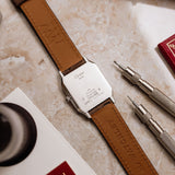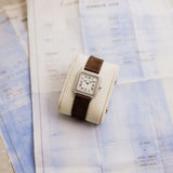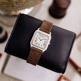 Launched by Cartier during the early 1990s and sold in 1994, the Santos Dumont Ref. 1575 boasts a satin-finished platinum case characterized by its sleek design, courtesy of the hand-wound Frédéric Piguet caliber.
