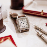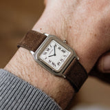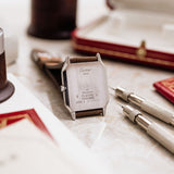 There is a real feeling of special when wearing this Santos Dumont. The cool platinum case sits flat and smooth on the wrist, its minimal height and slimline construction allowing it to fit with complete ease under any style of sleeve. Unobtrusive yet fabulously distinct in its appearance, it is an absolute delight to wear.