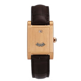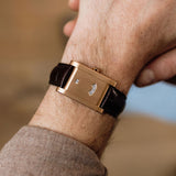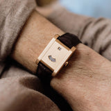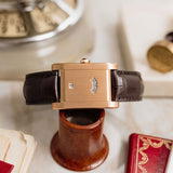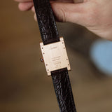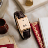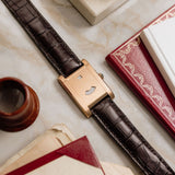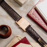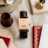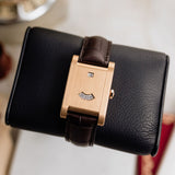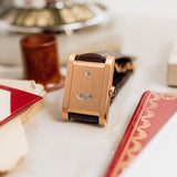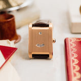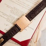 The 18k rose gold case of this reference is undoubtedly a Tank, however its evolved a substantial amount from the traditional Louis Cartier. The Tank à Guichet has a broader presence, measuring 26mm wide by 37mm tall, with the flanking case sides sitting flatter and a little more squared off. The case is expertly vertically brushed with incredible levels of clarity and detail. This watch's bright, chamfered sides subtly and ingeniously elevate its charm, bettered by the rose gold hue.