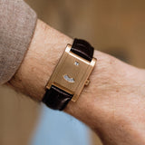 Understated sophistication and pure refinement spring to mind when strapping this Cartier to the wrist. At 26mm x 37mm, this 2817 Tank à Guichet is a superb size for a rectangular watch, framing the wrist it sits on easily. The 2817 allows for momentary adjustments to our perception of time and almost forces the wearer to slow down and enjoy each passing minute in detail as they tick away.