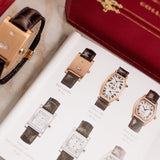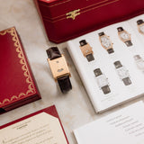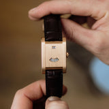 From 1917 onwards, the Tank became a true icon of many worlds and subsequent evolutions of its core DNA were created. The Cintrée, the Basculante, The Chinoise and the Tank à Guichet, to name just a few. The latter is a deeply fascinating and whimsical creation that first arrived on the scene in 1928. This watch is undoubtedly a Tank in form, however the Tank à Guichet was the first Cartier jump hour. This pure, curious mystery of a watch was only produced in extremely limited quantities, an approach which the brand honoured in 1996 when the model returned to the range for just three pieces in 18k rose gold Twelve months later, 150 pieces were created in platinum, featuring a faceted ruby cabochon. In 1998 Cartier launched the Collection Privée Cartier Paris (or CPCP), the start of an exclusive collection of masterful, expertly made mechanical watches that respectfully looked back through the brand's incredible archive in exceedingly scarce numbers. Fast forward to 2006, and Cartier launches another limited run of the Tank à Guichet. This time now officially a part of the CPCP collection, this 100-piece run was made using a pink gold case and is where the model we have today comes from.