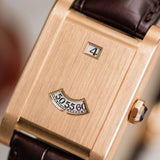 The Cartier Tank à Guichet 2817 houses the 9752 MC mechanical jump hour movement. Created by Piaget for Cartier, this 19 jewel movement is hand-wound and comes with beautifully decorated Cartier bridges that are discreetly hidden behind the solid case back of this piece.