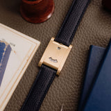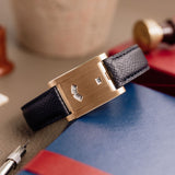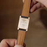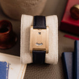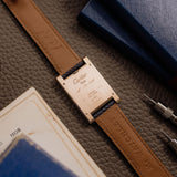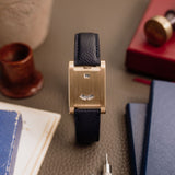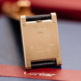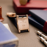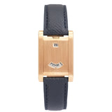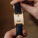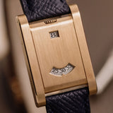 This one of three Tank à Guichets in pink gold dates from 1996 and is available in great condition, displaying minimal hairline. Some oxidisation can be seen on the caseback and the included original Cartier deployant clasp. The watch is available fitted to a Custom Mr Watchley Grained Midnight blue Cartier strap.