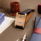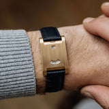 The form of the Tank à Guichets is a little different from convention. The model measures 24mm wide by 35mm, with the brancards sitting flatter and squared off than a Tank Louis. As a result, its form is substantial and masculine as its pink gold realisation is predominantly vertically brushed. Aside from its more unique take on the Tank, the other major visual highlight is its crown situated at twelve. While there are documented examples of Guichets’ from the 1930s with crowns at three, this 1996 example is a re-issue of the model purchased by Maharajah of Patiala in 1928 with a central crown. Historical provenance aside, its placement is also wonderfully symmetrical.