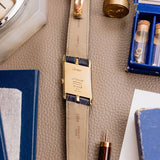 Measuring 26.5mm x 41 mm, Cartier's first move was to up the ante with the case. Gracefully elongating and graciously expanding the Asymétrique's unique and entirely unconventional diamond form, whilst lightly amplifying and rounding its slanted, yellow gold brancards. This touch of new, resolute presence to the Asymétrique saw the Cartier timepiece truly come into its own. It was a graceful yet bold opening up of its form, which led to the most perfect frame for the classic and instantly recognisable CPCP silvered dial. The unique 'cut' of the Asymétrique allowing for the intricate rosette guilloché, which extends into every last millimetre of every single angle of the dial, to have just infinite fun with the light. Vibrantly rolling and radiating across the dial, with such stunning ease.