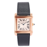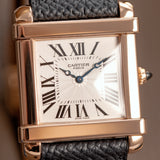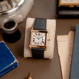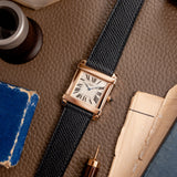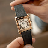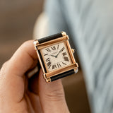 The dial is completed with Cartier’s trademark Roman numerals printed in black on the outer perimeter, which are traced on their internal side by unconnected printed black minute markers. Cartier Paris sits, perfectly centered, just below the 12 and above a small rose encapsulating the central point of the dial, which is completed with blue steel Breguet hands and a beaded, blue cabochon crown. The dial, rose gold case and rose gold folding buckle that accompanies this watch are all signed. As with all CPCP models, every detail is perfect.