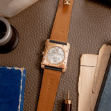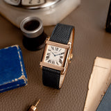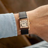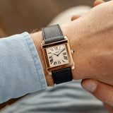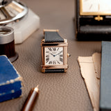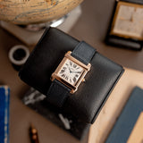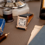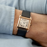 A perfect square, perfect for all occasions. This Tank Chinoise, so wonderfully unique in its form, would be just as at ease placed with jeans and a soft wool sweater as it would with a beautifully tailored suit. Its shape and solid assembly allow it to sit very comfortably and neatly on the wrist, and the case height means it will glide easily under clothing.