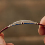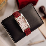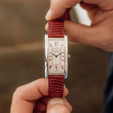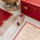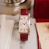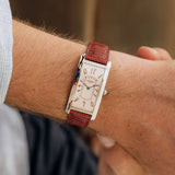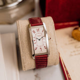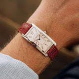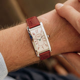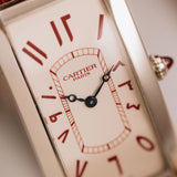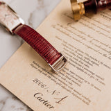 Like a custom Cartier dream. The Tank Cintrée is simply hard to beat in terms of style/comfort ratio. The form of the case allows the watch to sit perfectly and seamlessly on the wrist, whilst projecting an extremely elegant and ordered aesthetic. It is a style of watch that has the incredible ability to work at every angle, in every moment and at any given time. This extremely exclusive Cintrée, with its impeccably matched and original Cartier Lizard strap, is a raring red Cartier delight on the wrist.