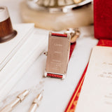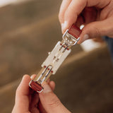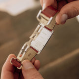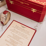The dial is 18k gold opaline and silvered, with the subdued yet rich depth of its off-white hue providing the perfect backdrop for the rich burgundy that colours every single marking on the dial. From the printed 'Cartier Paris' signature at 12 - framed by Cartier's traditional railway minute track - to the 'Swiss made' at 6 and the elegant numerals expanding outwardly from the centre, it is Cartier's iconic and vibrant colour that envelops and enriches the entire piece. Blue Breguet hands being the only element to deviate from the rolling red theme, allowing for time to be perfectly read.