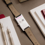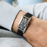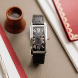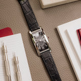 The dial is where this NSO stands out from traditional creations by La Maison, as the well-established script is flipped on its head with white printing from the stretched Roman numerals to the railroad track sitting on a fumé grey dial. While not as seldom seen as you may assume, using pomme watch hands for Tanks is always a delight that overloads the allure. Tying the entire appearance of this contemporary styled Cintrée is a grey alligator strap.