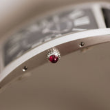 The piece carries a high-polished finish to the distinctive vertical brancards that flank the watch, and a profile look reveals the real magic of the Cintrée's case, as its svelteness and curve envelop the wrist with minimal effort as if it hails from nature. Such is the beautiful restraint of the Tank; the only remaining external prominent detail is a beaded crown sitting at three with a ruby cabochon.