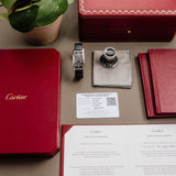 This 2023 Cartier Cintrée NSO is sold as a complete set, and it comes with its Cartier Pin buckle and original grey Cartier alligator strap.
