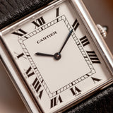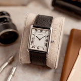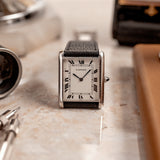 When a vintage Louis Cartier Tank watch emerges, the level of appeal starts to rise. If an exceptionally scarce vintage Louis Cartier Tank watch, in nearly flawless condition, previously owned by one of Cartier's most renowned collectors, becomes available, the attractiveness factor goes even higher. This is when we step into the realm of unparalleled desirability. Such is the case with the stunning white gold 1970s Tank Louis Cartier Automatique "Jumbo," also referred to as the vintage Tank XL.