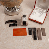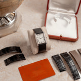 Apart from its exceptional state, this highly uncommon vintage watch is accompanied by its box, papers, and an exceedingly scarce 18mm white gold Cartier folding buckle from that time period. Beyond its rarity, this timepiece holds special significance as it is the very watch showcased in the book "CARTIER The Gentleman's Files" by George Cramer. The package also encompasses the mentioned book and a collection of Cartier straps. Furthermore, documents from its most recent servicing at Cartier have been incorporated as well.