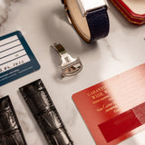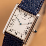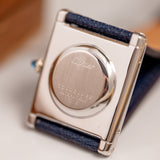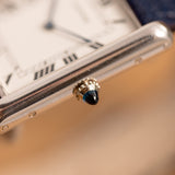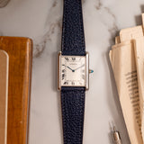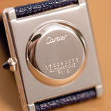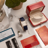 In addition to its superb condition, this very rare vintage timepiece comes with its box, papers and an extremely rare 18mm white gold Cartier folding buckle of the era. Recent service papers from WEMPE are also included and Cartier alligator strap. A Mr Watchley Madras blue strap has also been custom made for the piece and is included in the set.