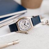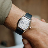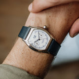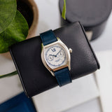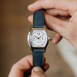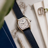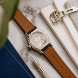 The Tortue case exhibits graceful, curved lines and polished surfaces throughout. Its dimensions measure 34mm by 43mm (lug to lug), striking a balance between a timeless appearance and contemporary preferences.