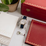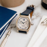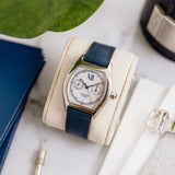 The Tortue design originated in 1912 and was just the third wristwatch to be designed by Louis Cartier. While the Tortue never garnered the same hype as the Tank would in later years, it did - and still does - strike a chord with Cartier enthusiasts. Its unique form made it the ideal model to become one of the very first Cartier timepieces to incorporate a complication and in the late 1920s, Cartier released its first Tortue Monopoussoir. A chronograph operated by a single push-button, contained within the crown: one push to start, a second push to stop and a third to reset. A neat, chic complication that is seldom seen - even today. When it came around to the creation of the now highly-regarded Collection Privée Cartier Paris in the late 1990s, one of Cartier's first timepieces with a complication was a must to revisit. 3 versions of the CPCP Tortue Monopoussoir were released. One in yellow gold limited, one in pink gold and one in white gold. All 3, understandably, are highly coveted timepieces..