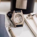 If there were ever to be a Cartier timepiece that could be said to really evoke that sense of 'King' (King of Jewellers), then this Tortue Monopoussoir would be a decidedly strong candidate. So rich and resplendent in heritage both from a Cartier perspective and from that of modern watchmaking, so utterly beautiful in its aesthetic composition and form - this timepiece, beyond any shadow of a doubt, is one of the most impressive crown jewels of haute horlogerie. Yet, in spite of the vast historical weight it carries, it is a timepiece that wears with such effortless and charming ease. Its dimensions, far from being over-bearing, are perfectly contained. The solid yet flowing and seamless structure of the watch, together with the slight curve of the caseback, allow for the piece to simply envelop the wrist. This Tortue is the embodiment of elegant masculinity, with an irresistible golden flair of the extraordinary.