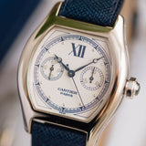 This Cartier Tortue Monopoussoir 2396 is in great condition with light signs of wear. It comes as a full set, with signature red Cartier CPCP box and complementing papers. The watch comes with its original Cartier white gold folding buckle.