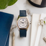 This manual-winding, 18K white gold medium-sized Cartier Monopoussoir is part of the Collection Privée Cartier Paris and was produced in a limited numbers. Elegance and a vintage feel are combined in the rosette guilloché patterned dial design, blued steel Breguet style hands and an inky blue round minute track as an homage to the Tortue Monopoussoirs of the twenties.