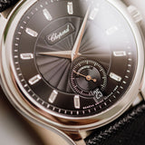 Michel Parmigiani designed the movement in conjunction with Chopard taking three years to develop. The movement is awash with black polishing from its swan neck regulator to each screw head. The anglage on each bridge, alongside the engraved and signed platinum micro-rotor, glows effortlessly and plays with light and shadow.