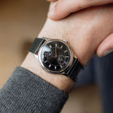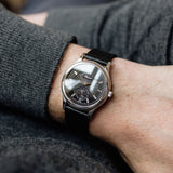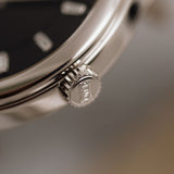 This particular iteration stands out exceptionally on both male and female wrists, distinguishing itself from other 1860 models. The captivating black dial with baguettes hour markers, not only grabs attention but also boasts added depth due to the intricately adorned guilloché pattern. With its stepped bezel and understated case, the watch presents a contemporary wrist presence that is primarily defined by its dial. The lugs contribute sensibly to its overall appearance.