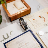 This exclusive Chopard LUC 16/1860/2S with black guilloché dial is sold complete with its original box, warranty papers, COSC papers, Geneva Seal papers, additional hunter-style caseback, white gold pin buckle, manual, and leaflets. The watch is offered in mint condition.