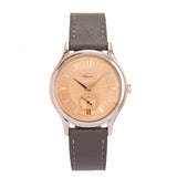 The dial on this 16/1860/2 is detailed and precise in its design and execution, yet simultaneously undiluted. Crafted from gold by Metalem, the salmon tones of the base house a beautiful handcrafted engine-turned stepped dial surrounded by a simplified seconds track before presenting the sharply shaped raised arrow hour markers. Complementing these are a large set of dauphine-style hands sitting just above a subsidiary seconds register, with concentric circles and half of the dial matching date aperture at six. The matching salmon aperture window is worth bringing to attention, as this extra nuance is yet another example of Chopard's keen eye. Like the dial they sit on, the hour markers and handset are also solid gold. This traditionally configured dress watch is simply signed 'Chopard' at twelve and includes 'automatic' neatly within its sub-register.