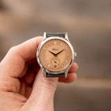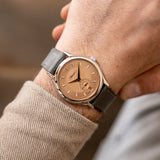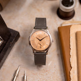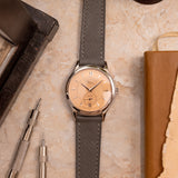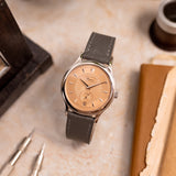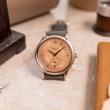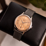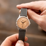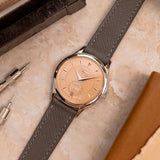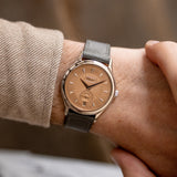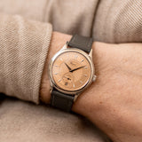 On either a male or female wrist, this specific expression truly excels unlike any other 1860, as its desirable salmon dial doesn’t just offer eye-catching appeal thanks to its tone, but the additional depth achieved by its finely decorated guilloché pattern is simply wonderful. Due to its stepped bezel and minimal case, the watch has a contemporary wrist presence appropriately dominated by its dial. It's also worth highlighting the lugs, which further sensibly aid its presence. It’s difficult to downplay the importance of this significant 1860; for Chopard connoisseurs and experts within the neo-vintage space alike.